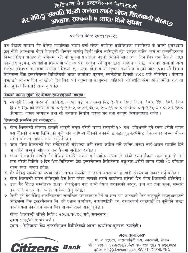 प्रकाशित भएको मितिले सात (०७) दिन भित्र यस बैंकको शाखा कार्यालय बुटवल, रुपन्देहीमा शिलबन्दी बोलपत्र पेश गर्नहुन यसै सूचनाद्वारा आव्हान गरिन्छ । बोलपत्र सम्बन्धी अन्य शर्तहरु बोलपत्र फारममा उल्लेख गरिएको छ । उक्त बोलपत्र यो सूचना प्रकाशित भएको आठ (०८) औं दिनमा सिटिजन्स बैंक इन्टरनेसनल लिमिटेडको शाखा कार्यालय बुटवल, रुपन्देहीमा दिनको ४:०० बजे खोलिनेछ । बोलपत्र बुझाउने अन्तिम दिन वा खोल्ने दिन बिदा पर्न गएमा वा काबुभन्दा बाहिरको परिस्थिति परेमा सोको भोलि पल्ट वा बैंक खुलेको दिनलाई सम्झनु पर्नेछ ।
