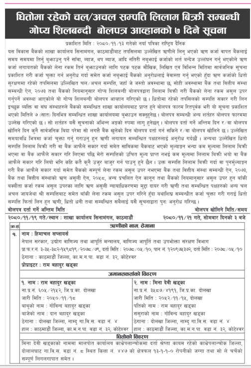 यस विकास बैंकको शाखा कार्यालय सिनामंगल, काठमाडौबाट तपसिलमा उल्लेखित ऋणीले लिनु भएको ऋण कर्जा वापत बैंकलाई | समय समयमा तिनुं बुझाउनु पर्ने साँवा, ब्याज, थप व्याज, आदि नतिरी नबुझाई कर्जाको शर्त बन्देज उल्लंघन गर्नु भएकोले ऋण | कर्जा लगायतको बैंकको लेना रकम तिर्न बुझाउनको लागि पटक पटक मौखिक, लिखित एवं विभिन्न मितिमा सार्वजनिक सूचना | प्रकाशित गरी कर्जा चुक्ता गर्न अनुरोध गर्दा समेत कर्जा नबुझाई बैंकको अनुरोधलाई वेवास्ता गर्नु भएको हुँदा ऋण कर्जाको धितो सुरक्षणमा रहेको तपसिलमा उल्लिखित चल अचल सम्पत्ति, जहाँ जे जस्तो अवस्थामा छ, सोही अवस्थामा बैंक तथा वित्तीय संस्था सम्बन्धी ऐन, २०७३ तथा बैंकको नियमानुसार गोप्य शिलबन्दी बोलपत्रद्वारा लिलाम बिक्री गरी बैंकको लेना रकम असुल उपर |गर्नुपर्ने अवस्था आएकोले यो गोप्य शिलबन्दी बोलपत्र आव्हान गरिएको छ । धितोमा रहेको तपसिलको सम्पत्ति सकार गरी लिन | इच्छुक व्यक्ति वा संघ संस्थाहरुले बैंकको सम्बन्धित शाखा कार्यालयबाट प्राप्त हुने बोलपत्र फारम रितपूर्वक भरी यो सूचना प्रकाशित | भएको मितिले ७ (सात) दिनभित्र सम्बन्धित शाखा कार्यालयमा बुझाउन सक्नुहुनेछ । बोलपत्र सम्बन्धी अन्य शर्तहरु बोलपत्र फारममा उल्लेख गरिएको छ । सो शर्तहरु यसै सूचनाको अभिन्न अङ्गको रुपमा लागु हुनेछन् । बोलपत्र दर्ता गर्ने अन्तिम दिन र / वा बोलपत्र | खोलिने दिन कुनै सार्वजनिक विदा परेमा सो लगत्तै बैंक खुलेको दिन बोलपत्र दर्ता गर्न सकिने र / वा बोलपत्र खोलिने छ । उल्लेखित समयावधि भित्रमा कर्जा चुक्ता गर्नु गराउनु हुन ऋणी लगायत सम्बन्धित पक्षहरुलाई अनुरोध गर्दछौं । अन्यथा उल्लेखित धितो सम्पत्ति लिलाम बिक्री गरी वा बैंक आफैले सकार गर्दा समेत साविकमा बैंकबाट भएको मुल्याइन भन्दा कम मूल्यमा लिलाम बिक्री | भएमा वा बैंक आफैले सकार गरि लिएमा पछि मेरो सम्पत्तिको उचित मूल्य प्राप्त नभई कम मूल्यमा लिलाम बिक्री भयो वा बैंक आफैले सकार गरि लियो भनि कहि कतै कुनै उजुर बाजुर गर्न पाउनु हुने छैन । उक्त सम्पत्ति लिलाम बिक्री गर्दा वा पुनर्मुल्याइन गरी बैंक आफैले सकार गर्दा समेत बैंकको सम्पूर्ण लेना रकम असुल उपर नभएमा बैंक तथा वित्तीय संस्था सम्बन्धी ऐन, २०७३, | बैंक तथा वित्तीय संस्थाको ऋण असुली ऐन, २०५८ अन्य प्रचलित ऐन कानून तथा बैंकको नियमानुसार असुल उपर हुन बाँकी बक्यौता कर्जा रकम असुल उपरका लागि ऋण असुली न्यायाधिकरणमा मुद्दा दायर गरी ऋणी तथा सम्बन्धित पक्षहरुको अन्य चल | अचल जायजेथा श्री सम्पत्तिबाट समेत बाँकी लेना रकम असुल उपर गरिने हुँदा यथाशिघ्र सम्बन्धीत कर्जा चुक्ता गरी गराई धितो सम्पत्ति फिर्ता लिन हुन ऋणी, धितो धनी तथा सम्बन्धित सबैलाई यसै सू