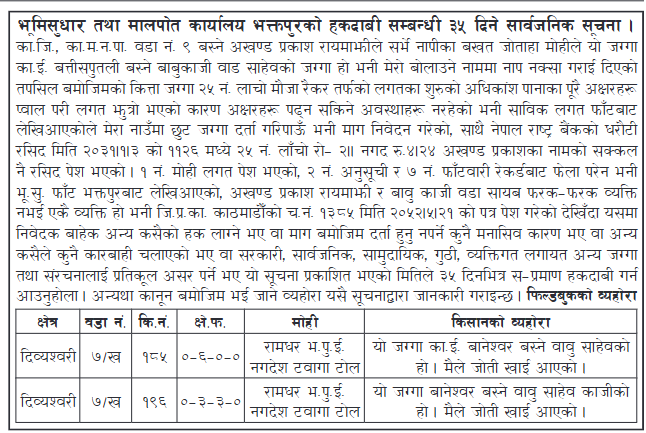 का.जि. का.म.न.पा. वडा नं. ९ बस्ने अखण्ड प्रकाश रायमाझीले सर्भे नापीका बखत जोताहा मोहीले यो जग्गा का.ई. बत्तीसपुतली बस्ने बाबुकाजी वाड साहेवको जग्गा हो भनी मेरो बोलाउने नाममा नाप नक्सा गराई दिएको तपसिल बमोजिमको कित्ता जग्गा २५ नं. लाचो मौजा रैकर तर्फको लगतका शुरुको अधिकांश पानाका पूरै अक्षरहरू प्वाल परी लगत झुत्रो भएको कारण अक्षरहरू पढ्न सकिने अवस्थाहरू नरहेको भनी साविक लगत फाँटबाट लेखिआएकोले मेरा नाउँमा छुट जग्गा दर्ता गरिपाऊँ भनी माग निवेदन गरेको, साथै नेपाल राष्ट्र बैंकको धरौटी रसिद मिति २०३१।१३ को ११२६ मध्ये २५ नं. लाँचो रो- २॥ नगद रु. ४।२४ अखण्ड प्रकाशका नामको सक्कल नै रसिद पेश भएको। १ नं. मोही लगत पेश भएको, २ नं. अनुसूची र ७ नं. फाँटवारी रेकर्डबाट फेला परेन भनी भू.सु. फाँट भक्तपुरबाट लेखि आएको, अखण्ड प्रकाश रायमाझी र बावु काजी वडा सायब फरक-फरक व्यक्ति नभई एकै व्यक्ति हो भनी जि.प्र.का. काठमाडौँको च.नं. १३८५ मिति २०५२ ५ २१ को पत्र पेश गरेको देखिँदा यसमा निवेदक बाहेक अन्य कसैको हक लाग्ने भए वा माग बमोजिम दर्ता हुनु नपर्ने कुनै मनासिव कारण भए वा अन्य कसैले कुनै कारबाही चलाएको भए वा सरकारी, सार्वजनिक, सामुदायिक, गुठी, व्यक्तिगत लगायत अन्य जग्गा तथा संरचनालाई प्रतिकूल असर पर्ने भए यो सूचना प्रकाशित भएको मितिले ३५ दिनभित्र स-प्रमाण हकदाबी गर्न आउनुहोला । अन्यथा कानून बमोजिम भई जाने व्यहोरा यसै सूचनाद्वारा जानकारी गराइन्छ ।