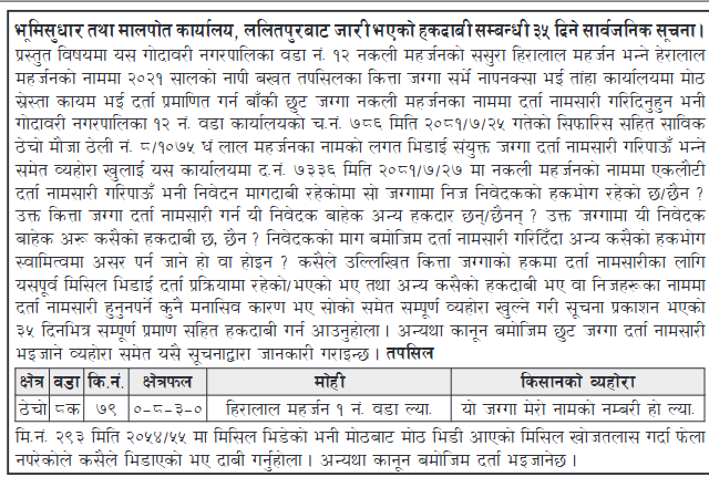 प्रस्तुत विषयमा यस गोदावरी नगरपालिका वडा नं. १२ नकली महर्जनको ससुरा हिरालाल महर्जन भन्ने हेरालाल महर्जनको नाममा २०२१ सालको नापी बखत तपसिलका कित्ता जग्गा सर्भे नापनक्सा भई तांहा कार्यालयमा मोठ सेस्ता कायम भई दर्ता प्रमाणित गर्न बाँकी छुट जग्गा नकली महर्जनका नाममा दर्ता नामसारी गरिदिनुहुन भनी गोदावरी नगरपालिका १२ नं. वडा कार्यालयको च.नं. ७८६ मिति २०८१ / ७ / २५ गतेको सिफारिस सहित साविक ठेचो मौजा ठेली नं. ८/१०७५ घं लाल महर्जनका नामको लगत भिडाई संयुक्त जग्गा दर्ता नामसारी गरिपाऊँ भन्ने समेत व्यहोरा खुलाई यस कार्यालयमा द.नं. ७३३६ मिति २०८१ / ७ / २७ मा नकली महर्जनको नाममा एकलौटी | दर्ता नामसारी गरिपाऊँ भनी निवेदन मागदाबी रहेकोमा सो जग्गामा निज निवेदकको हकभोग रहेको छ/छैन ? उक्त कित्ता जग्गा दर्ता नामसारी गर्न यी निवेदक बाहेक अन्य हकदार छन् / छैनन् ? उक्त जग्गामा यी निवेदक बाहेक अरू कसैको हकदाबी छ, छैन ? निवेदकको माग बमोजिम दर्ता नामसारी गरिदिँदा अन्य कसैको हकभोग स्वामित्वमा असर पर्न जाने हो वा होइन ? कसैले उल्लिखित कित्ता जग्गाको हकमा दर्ता नामसारीका लागि यसपूर्व मिसिल भिडाई दर्ता प्रक्रियामा रहेको / भएको भए तथा अन्य कसैको हकदाबी भए वा निजहरूका नाममा दर्ता नामसारी हुनुनपर्ने कुनै मनासिव कारण भए सोको समेत सम्पूर्ण व्यहोरा खुल्ने गरी सूचना प्रकाशन भएको ३५ दिनभित्र सम्पूर्ण प्रमाण सहित हकदाबी गर्न आउनुहोला ।