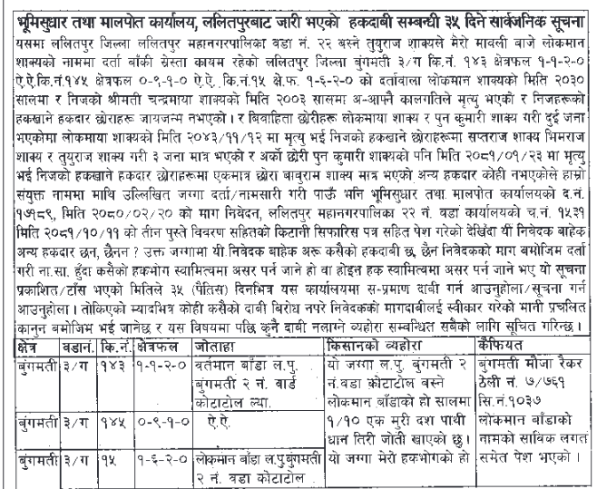 यसमा ललितपुर जिल्ला ललितपुर महानगरपालिका वडा नं. २२ बस्ने तुयुराज शाक्यले मेरो मावली बाजे लोकमान शाक्यको नाममा दर्ता बाँकी ग्रेस्ता कायम रहेको ललितपुर जिल्ला बुंगमती ३ /ग कि.नं. १४३ क्षेत्रफल १-१-२-० ऐ. ऐ.कि.नं. १४५ क्षेत्रफल ०-९-१-० ऐ. ऐ. कि.नं. १५ क्षे.फ. १-९-२-० को दर्तावाला लोकमान शाक्यको मिति २०३० सालमा र निजको श्रीमती चन्द्रमाया शाक्यको मिति २००३ सालमा अ-आफ्नै कालगतिले मृत्यु भएको र निजहरूको | हकखाने हकदार छोराहरू जायजन्म नभएको । र बिवाहिता छोरीहरू लोकमाया शाक्य र पुन कुमारी शाक्य गरी दुई जना भएकोमा लोकमाया शाक्यको मिति २०४३ / ११ / १२ मा मृत्यु भई निजको हकखाने छोराहरूमा सप्तराज शाक्य भिमराज शाक्य र तुयुराज शाक्य गरी ३ जना मात्र भएको र अर्को छोरी पुन कुमारी शाक्यको पनि मिति २०८१/०१/२३ मा मृत्यु भई निजको हकखाने हकदार छोराहरूमा एकमात्र छोरा बाबुराम शाक्य मात्र भएको अन्य हकदार कोही नभएकोले हाम्रो संयुक्त नाममा माथि उल्लिखित जग्गा दर्ता / नामसारी गरी पाऊँ भनि भूमिसुधार तथा मालपोत कार्यालयको द.नं. १७१८९ मिति २०८० / ०२ / २० को माग निवेदन, ललितपुर महानगरपालिका २२ नं. वडा कार्यालयको च.नं. १५३१ मिति २०८१ / १० / ११ को तीन पुस्ते विवरण सहितको किटानी सिफारिस पत्र सहित पेश गरेको देखिंदा थी निवेदक बाहेक अन्य हकदार छन, छैनन ? उक्त जग्गामा यी निवेदक बाहेक अरू कसैको हकदाबी छ, छैन निवेदकको माग बमोजिम दर्ता गरी ना. सा. हुँदा कसैको हकभोग स्वामित्वमा असर पर्न जाने हो वा होइन हक स्वामित्वमा असर पर्न जाने भए यो सूचना प्रकाशित / टाँस भएको मितिले ३५ (पैतिस) दिनभित्र यस कार्यालयमा स-प्रमाण दाबी गर्न आउनुहोला / सूचना गर्न आउनुहोला । तोकिएको म्यादभित्र कोही कसैको दाबी बिरोध नपरे निवेदकको मागदाबीलाई स्वीकार गरेको मानी प्रचलित कानुन बमोजिम भई जानेछ र यस विषयमा पछि कुनै दाबी नलाग्ने व्यहोरा सम्बन्धित सबैको लागि सूचित गरिन्छ ।