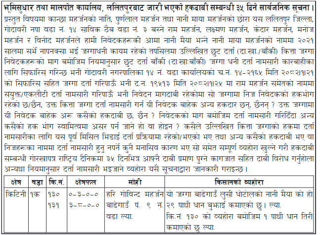 प्रस्तुत विषयमा कान्छा महर्जनको नाति, पुर्णलाल महर्जन तथा नानी माया महर्जनको छोरा यस ललितपुर जिल्ला, गोदावरी नपा वडा नं. १४ साविक ठैब वडा नं. ३ बस्ने राम महर्जन, लक्ष्मण महर्जन, केदार महर्जन, मनोज | महर्जन र विनोद महर्जनले हामी निवेदकहरूकी आमा नानी मैया भन्ने नानी माया महर्जनको नाममा २०२१ | सालमा सर्भे नापनक्सा भई जग्गाधनी कायम रहेको तपसिलमा उल्लिखित छुट दर्ता (दा. खा./बाँकी) कित्ता जग्गा निवेदकहरूको माग बमोजिम नियमानुसार छुट दर्ता बाँकी (दाःखाः बाँकी) जग्गा धनी दर्ता नामसारी कारबाहीका | लागि सिफारिस गरिन्छ भनी गोदावरी नगरपालिका १४ नं. वडा कार्यालयको च.नं. १४ - २१६५ मिति २०८२ १ २१ को सिफारिस सहित जग्गा दर्ता गरिपाऊँ भनी द.न. १९५१३ मिति २०८२।१।२५ मा राम महर्जन समेतको नाममा संयुक्त / एकलौटी दर्ता नामसारी गरिपाऊँ भनी निवेदन मागदाबी रहेकोमा सो जग्गामा निज निवेदकको हकभोग रहेको छ/छैन, उक्त कित्ता जग्गा दर्ता नामसारी गर्न यी निवेदक बाहेक अन्य हकदार छन्, छैनन् ? उक्त जग्गामा | यी निवेदक बाहेक अरू कसैको हकदाबी छ, छैन ? निवेदकको माग बमोजिम दर्ता नामसारी गरिदिँदा अन्य कसैको हक भोग स्वामित्वमा असर पर्न जाने हो वा होइन ? कसैले उल्लिखित कित्ता जग्गाको हकमा दर्ता | नामसारीका लागि यस पूर्व मिसिल भिडाई दर्ता प्रक्रियामा रहेको / भएको भए तथा अन्य कसैको हकदाबी भए वा | निजहरूका नाममा दर्ता नामसारी हुनु नपर्ने कुनै मनासिव कारण भए सो समेत सम्पूर्ण व्यहोरा खुल्ने गरी हकदाबी सम्बन्धी गोरखापत्र राष्ट्रिय दैनिकमा ३५ दिनभित्र आफ्नै दाबी प्रमाण पुग्ने कागजात सहित दाबी विरोध गर्नुहोला अन्यथा नियमानुसार दर्ता नामसारी भइजाने व्यहोरा यसै सूचनाद्वारा जानकारी गराइन्छ ।