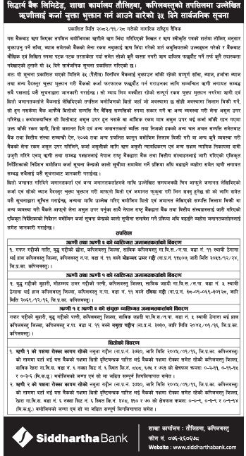 अतः यो सूचना प्रकाशित भएको मितिले ३५ (पैंतीस) दिनभित्र बैंकलाई बुझाउन बाँकी रहेको सम्पूर्ण साँवा, ब्याज, हर्जाना ब्याज तथा अन्य दैदस्तुर चुक्ता भुक्तान गरी बैंकको कर्जा फरफारक फछ्यौट गर्न गराउनका लागि सम्बन्धित ऋणी लगायत सम्बद्ध सबै पक्षलाई यसै सूचनाद्वारा जानकारी गराईन्छ । सो म्याद भित्र बक्यौता रहेको सम्पूर्ण रकम चुक्ता भुक्तान नगरेमा ऋणी एवं धितो जमानतकर्ताले बैंकलाई लेखिदिएको तपसिल बमोजिमको धितो जहाँ जो अवस्थामा छ सोही अवस्थामा लिलाम बिक्री गर्ने, सो हुन नसकेमा बैंक आफैँले धितोको सम्पत्ति गैर बैंकिङ्ग सम्पत्तिको रुपमा सकार गर्ने वा अन्य व्यवस्था गरी लेना असुल उपर गरिनेछ । कथंमकदाचित सो धितोबाट असुल उपर हुन नसके वा आंशिक रकम मात्र असुल उपर भई कर्जा बाँकी रहन गएमा उक्त बाँकी रकम ऋणी, धितो जमानत दिने एवं अन्य जमानतकर्ता व्यक्ति तथा निजको हकको अन्य चल अचल सम्पत्ति समेतबाट बैंक तथा वित्तीय संस्था सम्बन्धी ऐन, २०७३ तथा अन्य प्रचलित कानून बमोजिम लिलाम बिक्री गरी वा अन्य कुनै व्यवस्था गरी बैंकको लेना रकम असुल उपर गरिलिने, कर्जा असुलीको लागि ऋण असुली न्यायधिकरण एवं अन्य सक्षम न्यायिक निकायमा दावी उजुरी गरिने एवम् ऋणी तथा सम्बद्ध पक्षहरुलाई नेपाल राष्ट्र बैंकद्वारा बैंक तथा वित्तीय संस्थाहरुलाई जारी गरिएको एकिकृत निर्देशिकाको निर्देशन बमोजिम कर्जा सूचना केन्द्रको कालो सूचीमा समावेश गर्ने प्रक्रिया अघि बढाइने व्यहोरा समेत ऋणी लगायत सम्बद्ध सबैलाई यसै सूचनाबाट जानकारी गराईन्छ ।धितो जमानत गरिदिने जमानतकर्ता एवं अन्य जमानतकर्ताहरुले माथि उल्लेखित समयअवधी भित्र आफुले जमानत लेखिदिएको कर्जा एवं सोको ब्याज दैदस्तुर चुक्ता भुक्तान गरी आफ्नो धितो एवं जमानत फुकुवा गरी लिन सक्नु हुनेछ सो को लागि समेत यसै सूचनाद्वारा सूचित गराईन्छ, अन्यथा माथि उल्लेख गरिए बमोजिम धितो एवं जमानत लेखिएको सम्पत्ति लिलाम बिक्री वा अन्य व्यवस्था गरी बैंकले आफ्नो लेना असुल उपर गर्नुका साथै नेपाल राष्ट्र बैंकद्वारा बैंक तथा वित्तीय संस्थाहरुलाई जारी गरिएको एकिकृत निर्देशिकाको निर्देशन बमोजिम कर्जा सूचना केन्द्रको कालो सूचीमा समावेश गर्ने प्रक्रिया अघि बढाईने व्यहोरा जमानतकर्ताहरुलाई समेत जानकारी गराईन्छ ।