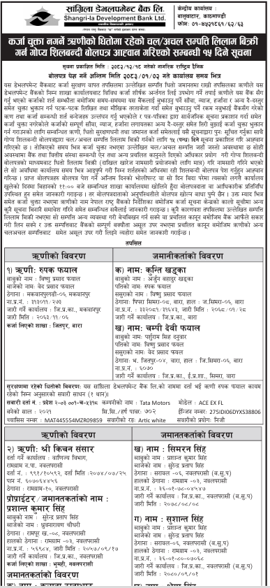 यस डेभलपमेन्ट बैंकबाट कर्जा सुरक्षण वापत तपसिलमा उल्लेखित सम्पत्ति धितो जमानतमा राखी तपसिलका ऋणीले यस डेभलपमेन्ट बैंकको निम्न शाखा कार्यालयबाट विविध कर्जा शीर्षक अर्न्तगत लिई उपभोग गर्ने तपाई ऋणीले यस बैंकसँग गर्नु भएको कर्जाको शर्त सम्झौता बमोजिम समय-समयमा यस बैंकलाई बुझाउनु पर्ने साँवा, व्याज, हर्जाना र अन्य दै- दस्तुर समेत चुक्ता भुक्तान गर्न पटक-पटक लिखित तथा मौखिक तरताकेता गर्दा समेत बुझाउनु पर्ने रकम नबुझाई बैंकसँग गरेको ऋण तथा कर्जा सम्बन्धी शर्त बन्देजहरु उल्लंघन गर्नु भएकोले र पत्र-पत्रिका द्वारा सार्वजनिक सूचना प्रकाशन गर्दा समेत कर्जा चुक्ता नगरेकोले कर्जाको सम्पूर्ण साँवा, व्याज, हर्जाना लगायतका अन्य दै- दस्तुर समेत तिरी बुझाई कर्जा चुक्ता भुक्तान गर्न गराउनको लागि सम्बन्धित ऋणी, धितो सुरक्षणधनी तथा जमानत कर्ता समेतलाई यसै सूचनाद्वारा पुनः सूचित गर्नुका साथै गोप्य शिलबन्दी बोलपत्रद्वारा चल / अचल सम्पत्ति लिलाम बिक्री गर्नको लागि १५ (पन्ध्र) दिने सूचना प्रकाशित गरि आह्वान गरिएको छ । तोकिएको समय भित्र कर्जा चुक्ता नभएमा उल्लेखित चल / अचल सम्पत्ति जहाँ जस्तो अवस्थामा छ सोही अवस्थामा बैंक तथा वित्तीय संस्था सम्बन्धी ऐन तथा अन्य प्रचलित कानुनले दिएको अधिकार प्रयोग गरी गोप्य शिलबन्दी बोलपत्रको माध्यमबाट धितो लिलाम बिक्री ( दाखिल खारेज नामसारी प्रयोजनको लागि मात्र ) गरि नामसारी गरिने भएको ले सो अवधिमा कार्यालय समय भित्र आइपुग्ने गरी निम्न शर्तहरुको अधिनमा रही शिलबन्दी बोलपत्र पेश गर्नुहुन आह्वान गरिन्छ । प्राप्त बोलपत्रहरु बोलपत्र पेश गर्ने अन्तिम दिनको भोलीपल्ट वा सो दिन बिदा परेमा त्यसको लगत्तै कार्यालय खुलेको दिनमा बिहानको ११:०० बजे सम्बन्धित शाखा कार्यालयमा खोलिने हुँदा बोलपत्रदाता वा आधिकारीक प्रतिनिधि उपस्थित हुन समेत जानकारी गराइन्छ । तर बोलपत्रदाताको अनुपस्थितीले बोलपत्र खोल्न बाधा पुग्ने छैन । उक्त म्याद भित्र समेत कर्जा चुक्ता नभएमा ऋणीको नाम नेपाल राष्ट्र बैंकको निर्देशिका बमोजिम कर्जा सूचना केन्द्रको कालो सूचीमा अन्य कुनै सूचना बिनानै समावेश गरिने समेत सम्बन्धित सबैलाई जानकारी गराइन्छ । कुनै कारणवश तपसिलमा उल्लेखित सम्पत्ति लिलाम बिक्री नभएमा सो सम्पत्ति अन्य व्यवस्था गरी बेचबिखन गर्न सक्ने वा प्रचलित कानून बमोजिम बैंक आफैले सकार गरी लिन सक्ने र उक्त सम्पत्तिबाट बैंकको सम्पूर्ण बक्यौता असूल उपर नभएमा प्रचलित कानून बमोजिम ऋणीको अन्य चलअचल सम्पत्तिबाट समेत असूल उपर गरी लिइने व्यहोरा समेत जानकारी गराईन्छ ।