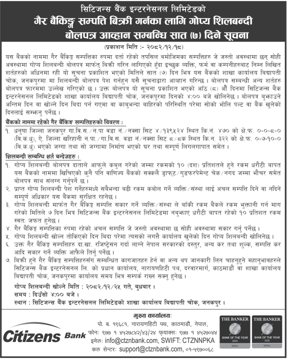 यस बैंकको नाममा गैर बैंकिङ्ग सम्पत्तिका रुपमा दर्ता रहेको तपसिल बमोजिमका सम्पत्तिहरु जे जस्तो अवस्थामा छन् सोही अवस्थामा गोप्य शिलबन्दी बोलपत्र मार्फत् बिक्री गरिन लागिएको हुँदा इच्छुक व्यक्ति, फर्म वा कम्पनीहरुबाट निम्न लिखित शर्तहरुको अधिनमा रही यो सूचना प्रकाशित भएको मितिले सात (७) दिन भित्र यस बैंकको शाखा कार्यालय विद्यापती चोक, जनकपुरमा मा शिलबन्दी बोलपत्र पेश गर्नहुन यसै सूचनाद्वारा आव्हान गरिन्छ । बोलपत्र सम्बन्धी अन्य शर्तहरु बोलपत्र फारममा उल्लेख गरिएको छ । उक्त बोलपत्र यो सूचना प्रकाशित भएको आँठ (८) औं दिनमा सिटिजन्स बैंक इन्टरनेसनल लिमिटेडको शाखा कार्यालय विद्यापती चोक, जनकपुरमा दिनको ४:०० बजे खोलिनेछ । बोलपत्र बुझाउने अन्तिम दिन वा खोल्ने दिन बिदा पर्न गएमा वा काबुभन्दा बाहिरको परिस्थिति परेमा सोको भोलि पल्ट वा बैंक खुलेको दिनलाई सम्झनु पर्नेछ ।