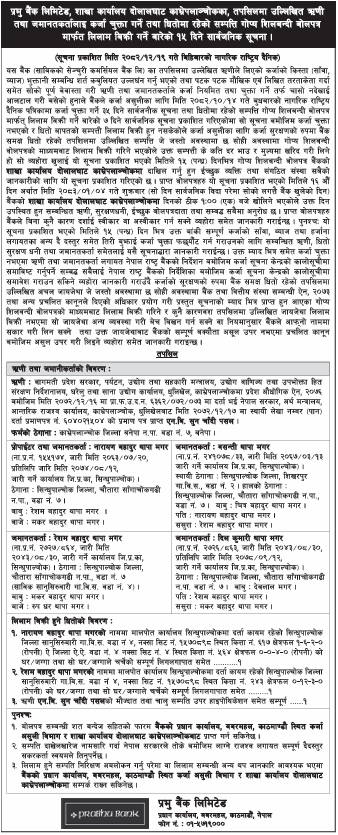 यस बैंक (साबिकको सेञ्चुरी कमर्सियल बैंक लि ) का तपसिलमा उल्लेखित ऋणीले लिएको कर्जाको किस्ता (साँवा, व्याज) भुक्तानी सम्बन्धि शर्त कबुलियत उल्लघंन गर्नु भएको तथा पटक पटक मौखिक एवं लिखित तरताकेता गर्दा समेत सोको पूर्ण बेवास्ता गरी ऋणी तथा जमानतकर्ताले कर्जा नियमित तथा चुक्ता गर्ने तर्फ चासो नदेखाई आलटाल गरी बसेको हुनाले बैंकले कर्जा असुलीका लागि मिति २०८२ / १० / १४ गते बुधबारको नागरिक राष्ट्रिय दैनिक पत्रिकामा कर्जा चुक्ता गर्ने ३५ दिने सार्वजनीक सूचना तथा धितोमा रहेको सम्पत्ति गोप्य शिलबन्दी बोलपत्र मार्फत् लिलाम विक्री गर्ने बारेको ७ दिने सार्वजनिक सूचना प्रकाशित गरिएकोमा सो सूचना बमोजिम कर्जा चुक्ता नभएको र धितो बापतको सम्पत्ती लिलाम विक्री हुन नसकेकोले कर्जा असुलीका लागि कर्जा सुरक्षणको रुपमा बैंक समक्ष धितो रहेको तपशिलमा उल्लिखित सम्पत्ति जे जस्तो अवस्थामा छ सोही अवस्थामा गोप्य शिलवन्दी वोलपत्रको माध्यमवाट लिलाम बिक्री गरिने भएकोले उक्त सम्पत्ती के कति दर भाउ र मुल्यमा खरिद गरी लिने हो सो व्यहोरा खुलाई यो सूचना प्रकाशित भएको मितिले १५ (पन्ध्र) दिनभित्र गोप्य शिलबन्दी बोलपत्र बैंकको शाखा कार्यालय दोलालघाट काभ्रेपलाञ्चोकमा दाखिल गर्नु हुन ईच्छुक व्यक्ति तथा संगठित संस्था सबैको जानकारीको लागि यो सूचना प्रकाशित गरिएको छ । प्राप्त बोलपत्रहरु यो सूचना प्रकाशित भएको मितिले १६ औं दिन अर्थात मिति २०८३/ ०१ /०४ गते शुक्रबार (सो दिन सार्वजनिक विदा परेमा सोको लगत्तै बैंक खुलेको दिन) बैंकको शाखा कार्यालय दोलालघाट काभ्रेपलाञ्चोकमा दिनको ठीक १:०० (एक) बजे खोलिने भएकोले उक्त दिन उपस्थित हुन सम्बन्धित ऋणी, सुरक्षणधनी, ईच्छुक बोलपत्रदाता तथा सम्बद्ध सबैमा अनुरोध छ । प्राप्त बोलपत्रहरु बैंकले बिना कुनै कारण दर्शाई स्वीकार वा अस्वीकार गर्न सक्ने व्यहोरा समेत जानकारी गराईन्छ । पुनश्चः यो सूचना प्रकाशित भएको मितिले १५ (पन्ध्र) दिन भित्र उक्त बांकी सम्पूर्ण कर्जाको साँवा, ब्याज तथा हर्जाना लगायतका अन्य दै दस्तुर समेत तिरी बुझाई कर्जा चुक्ता फछ्यौट गर्न गराउनको लागि सम्बन्धित ऋणी, धितो सुरक्षण धनी तथा जमानतकर्ता समेतलाई यसै सूचनाद्धारा जानकारी गराईन्छ । उक्त म्याद भित्र समेत कर्जा चुक्ता नभएमा ऋणी तथा जमानतकर्ता लगायत नेपाल राष्ट्र बैंकको निर्देशन बमोजिम कर्जा सूचना केन्द्रको कालोसूचीमा समाविष्ट गर्नुपर्ने सम्बद्ध सबैलाई नेपाल राष्ट्र बैंकको निर्देशिका बमोजिम कर्जा सूचना केन्द्रको कालोसूचीमा समावेश गराउन सकिने व्यहोरा जानकारी गराउँदै कर्जाको सूरक्षणको रुपमा बैंक समक्ष धितो रहेको तपसिलमा उल्लिखित अचल जायजेथा जे जस्तो अवस्थामा छ सोह